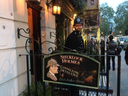 Na het bezoek aan de Tower Bridge, lopen we langs de Tower of Londen. Hier gaan we nu nog niet naartoe, dit bewaren we voor de volgende keer dat Max langskomt in december. We stappen op de Hop-on-Hop-off bus die ons naar de Sherlock Holmes pub brengt. Als fans van de gelijknamige films in Sherlock Holmes, genieten we in stijl van de wereldberoemde fictieve detective van een typische Engelse lunch. De sfeervolle pub ligt vlakbij Trafalgar Square en ademt een klassieke Victoriaanse sfeer met donker hout, glas-in-loodramen, oude foto’s van Londen en natuurlijk de nodige Sherlock Holmes spullen. Ook vind je hier een nagebouwde werkkamer van de beroemde detective.