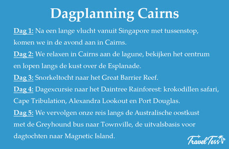 Na een relaxdag om onze jetlag uit te slapen en twee intensieve dagtrips naar het Great Barrier Reef en het Daintree regenwoud zit ons verblijf in Cairns er op. Als losse plaats is Cairns kleinschalig met een sfeervolle esplanade. Verder stelt het weinig voor, maar je kunt het gewoon niet los zien van de geweldige toeristische natuurattracties in de omgeving waarvoor Cairns dé uitvalsbasis is. Het is ook niet voor niets het startpunt of eindpunt van veel backpackers die de Australische oostkust rondreizen.
