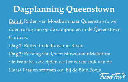Zoals we 2019 ook al hadden ontdekt tijdens onze eerdere Nieuw-Zeeland rondreis, is Queenstown een must-visit in Nieuw-Zeeland. Het is een plaatsje van 10.000 inwoners met twee gezichten: het dorpje is super gezellig en gemoedelijk terwijl in je in de omgeving de meest ruige en wilde activiteiten doet. Een bijzonder contrast dat veel avontuurlijke backpackers trekt. Raften, jetboating, bumby jumpen, skydiven, mountainbiken, canyoning en quad rijden; je kant het allemaal doen in dé adrenalinehoofdstad van Nieuw-Zeeland. Als je Queenstown bezoekt via de Haast Pass dan kun je tevens genieten van mooie natuur langs de route, zoals de Blue Pools, diverse watervallen en fraaie uitzichtpunten op de gletsjermeren in de omgeving.