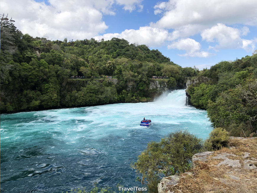 Wij parkeren onze auto bij de bijbehorende parkeerplaats waarvandaan het nog een klein kwartier lopen is naar het eerste uitzichtpunt waarna we via de brug over de waterval heen lopen. Aan de overkant heb je immers beter uitzicht over het kolkende water. Op het moment dat wij er zijn, scheurt er een jetboot met toeristen langs de waterval. Dit ziet er cool uit, maar van boven heb je minstens net zo’n goed beeld op de indrukwekkende natuurkrachten van de Huka Falls. Een bezoek aan de Huka Falls is gratis.